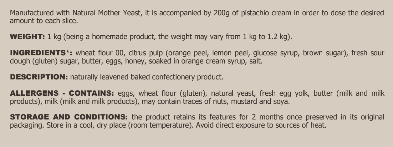 Sourdough panettone accompanied by 200g of pistachio cream in order to dose the desired amount to each slice.